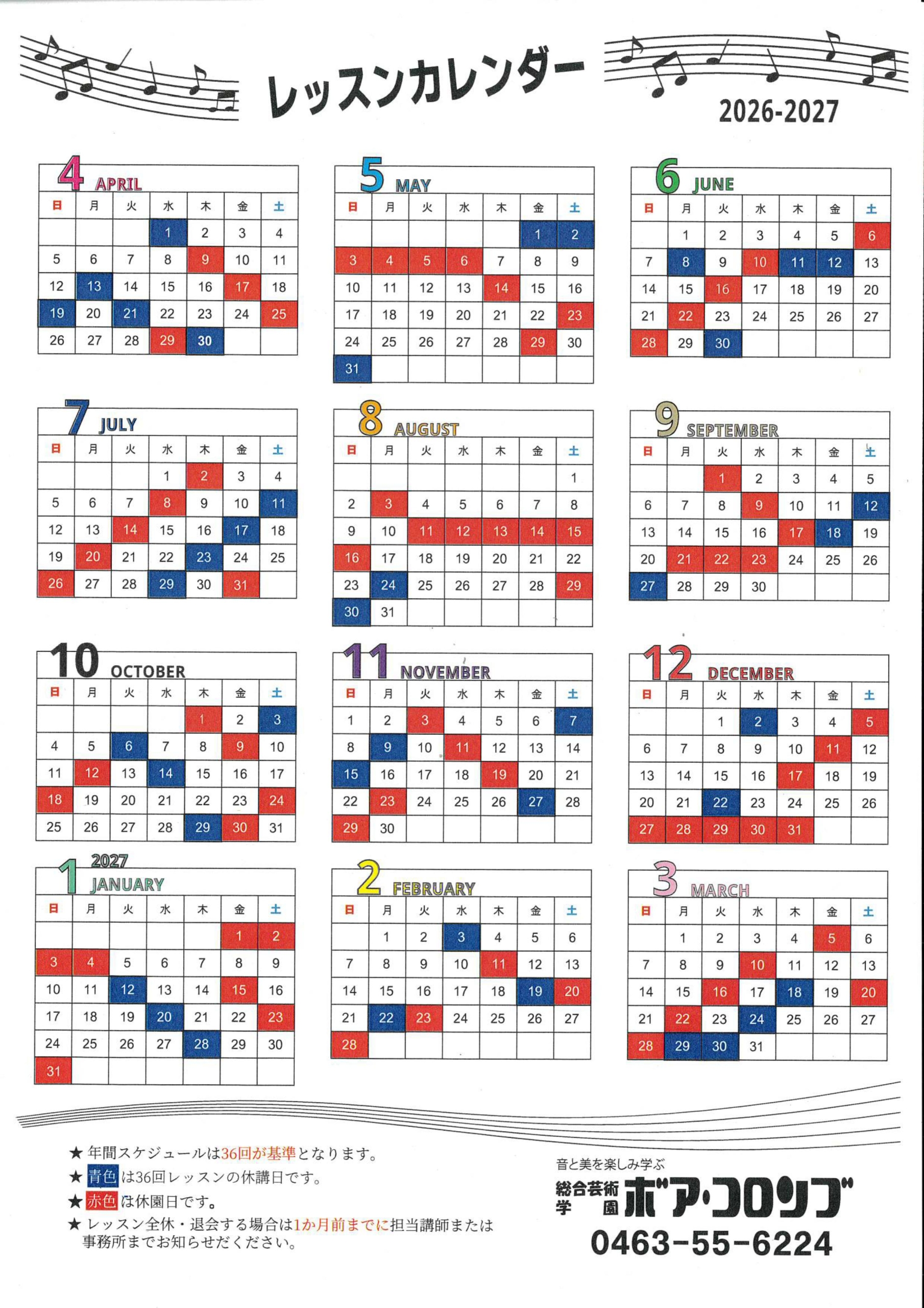 ※赤丸印はレッスン休日です。